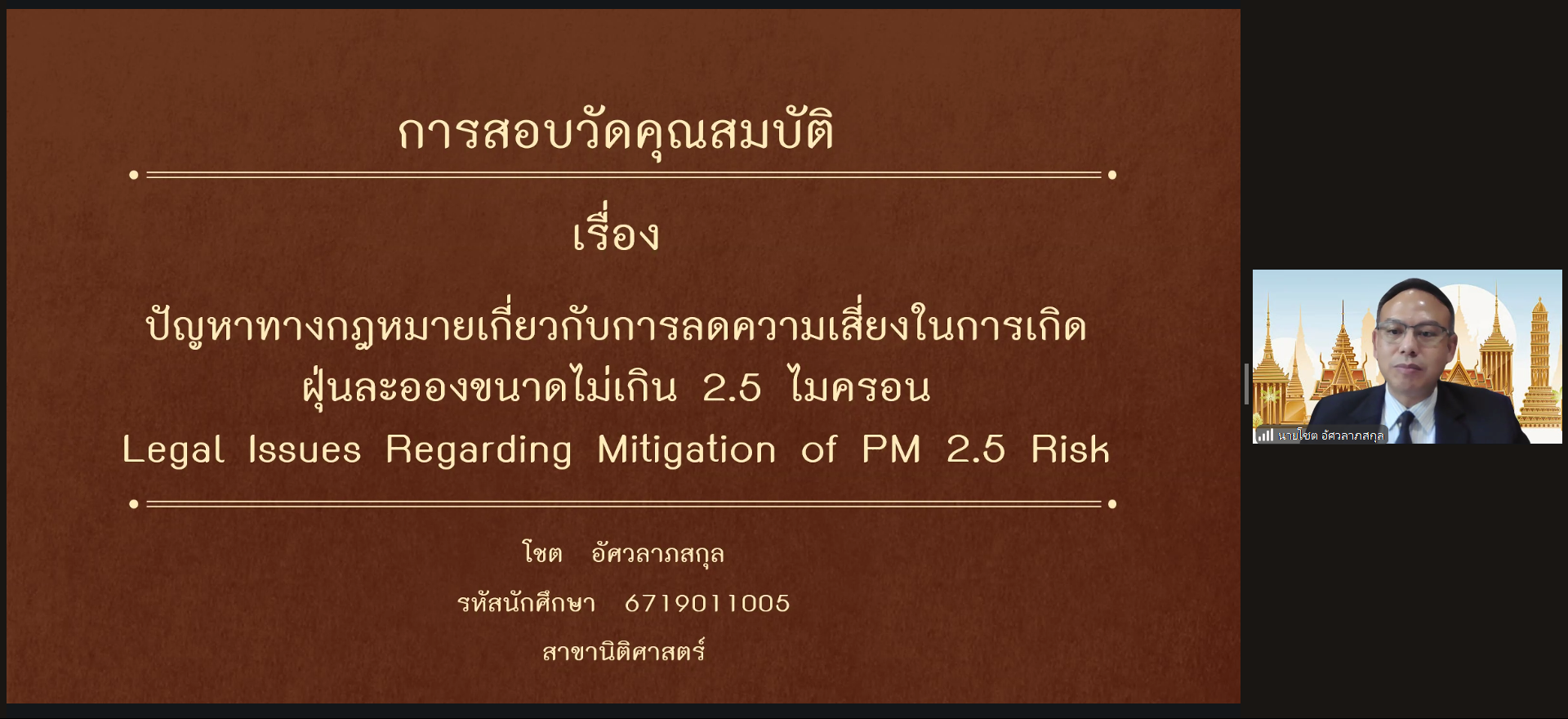หัวข้อดุษฎีนิพนธ์ เรื่อง "ปัญหาทางกฎหมายเกี่ยวกับการลดความเสี่ยงในการเกิดฝุ่นละอองขนาดไม่เกิน 2.5 ไมครอน"