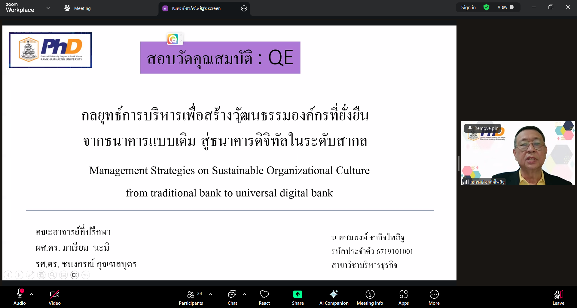 หัวข้อดุษฎีนิพนธ์ เรื่อง "กลยุทธ์การบริหารเพื่อสร้างวัฒนธรรมองค์กรที่ยั่งยืนจากธนาคารแบบเดิมสู่ธนาคารดิจิทัลในระดับสากล"