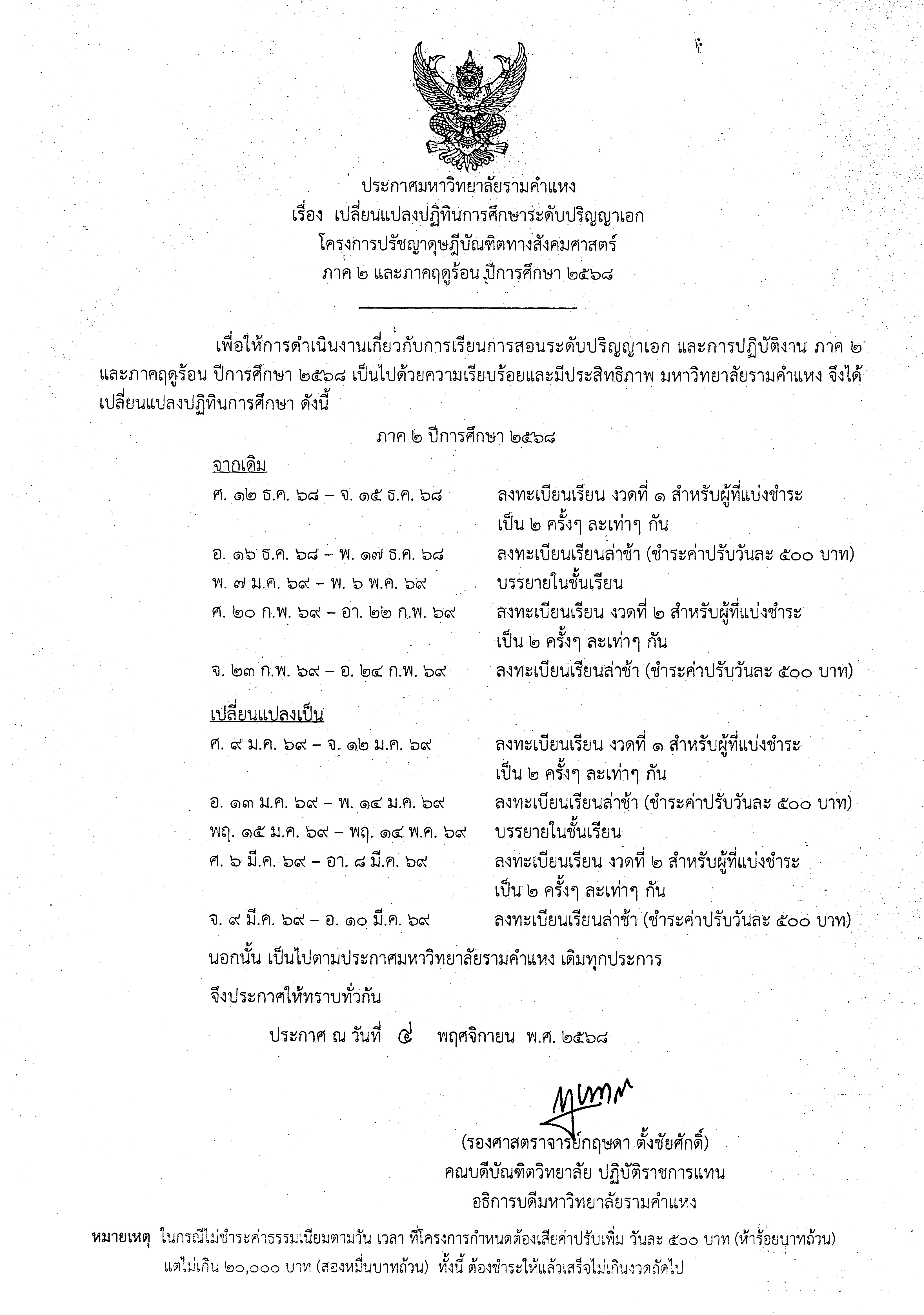 เปลี่ยนแปลงปฏิทินการศึกษาระดับปริญญาเอก ภาค 2 และภาคฤดูร้อน ปีการศึกษา 2568