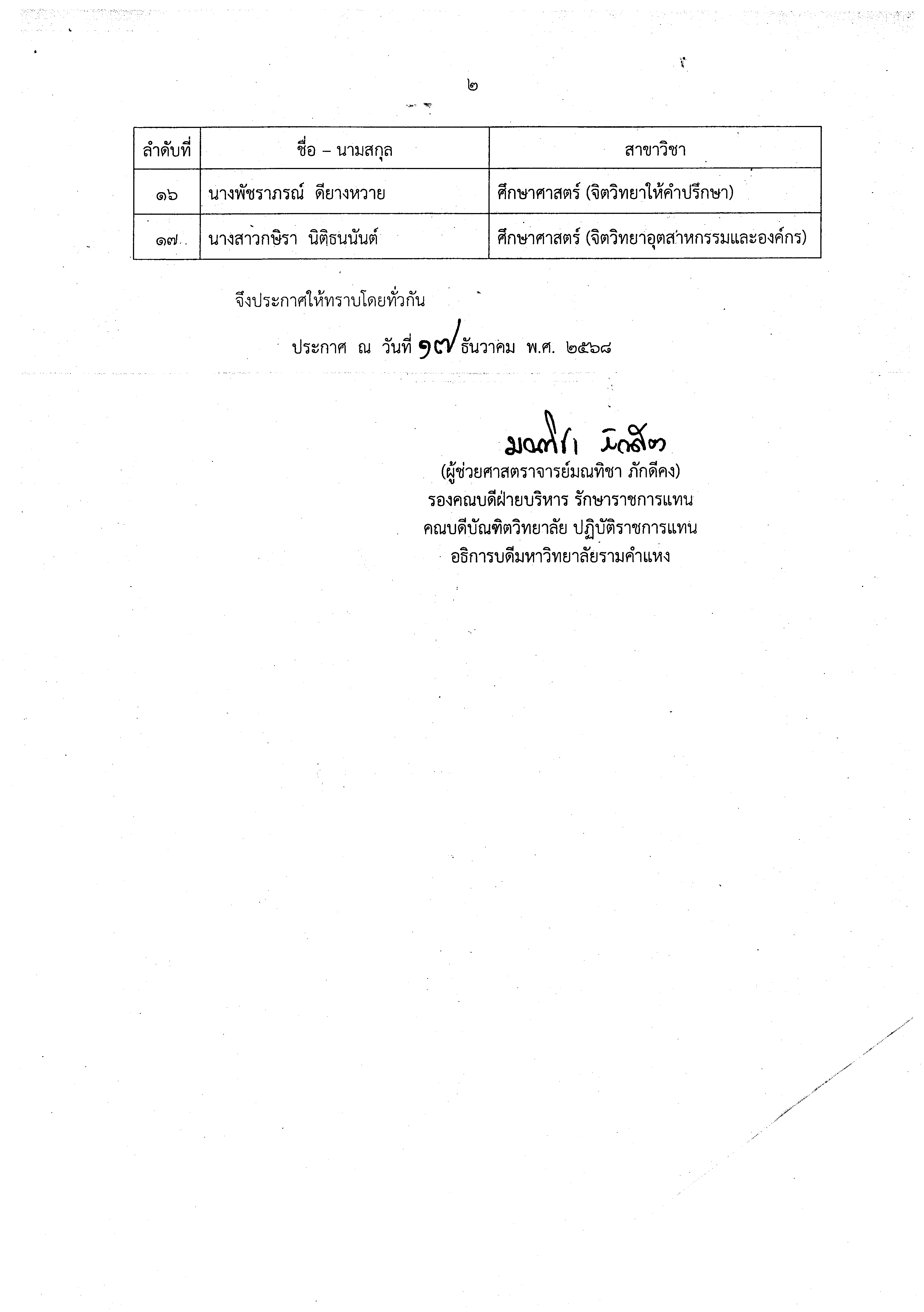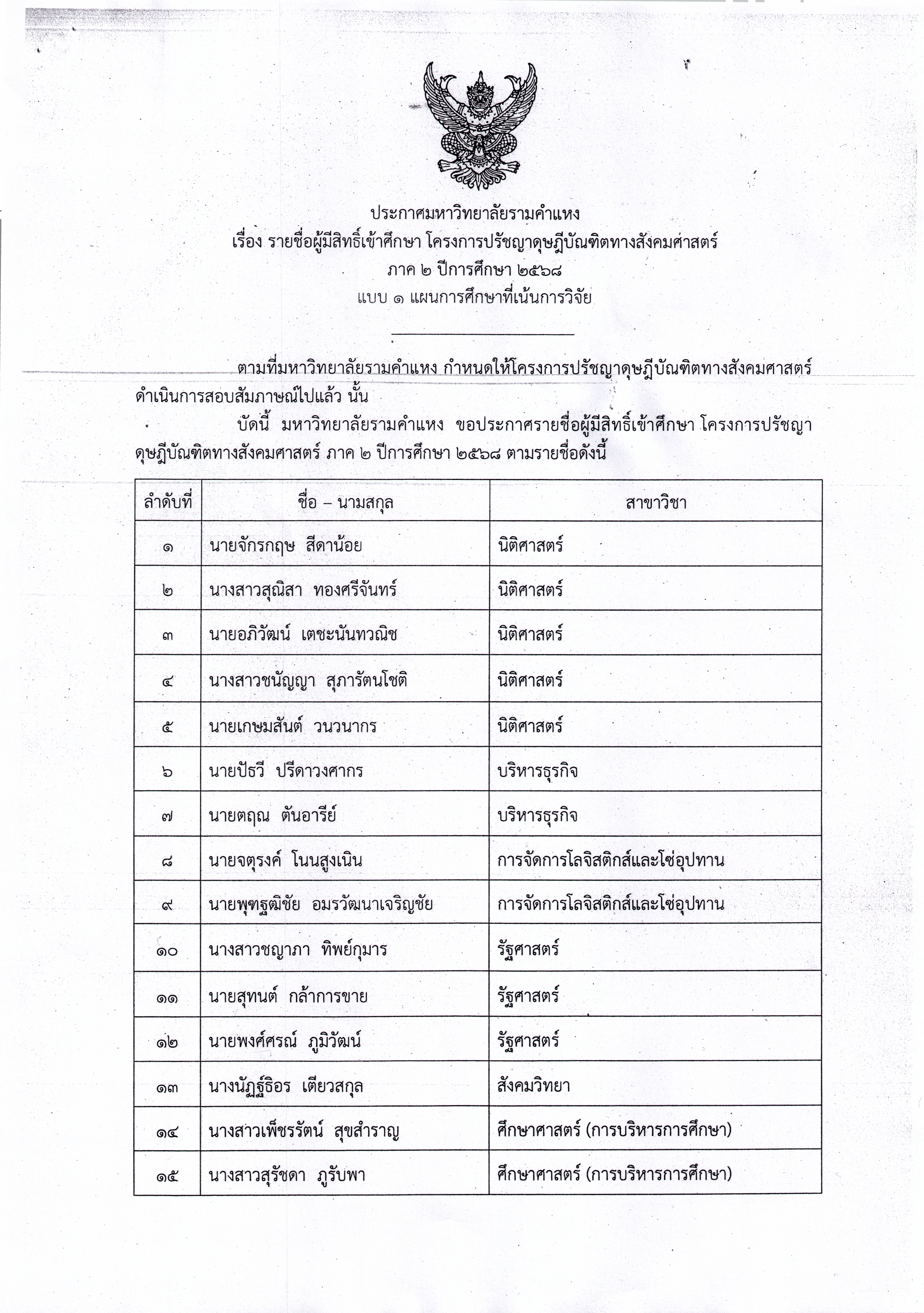 รายชื่อผู้สิทธิ์เข้าศึกษา โครงการปรัชญาดุษฎีบัณฑิตทางสังคมศาสตร์ภาค 2 ปีการศึกษา 2568 แบบ 1 แผนการศึกษาที่เน้นการวิจัย
